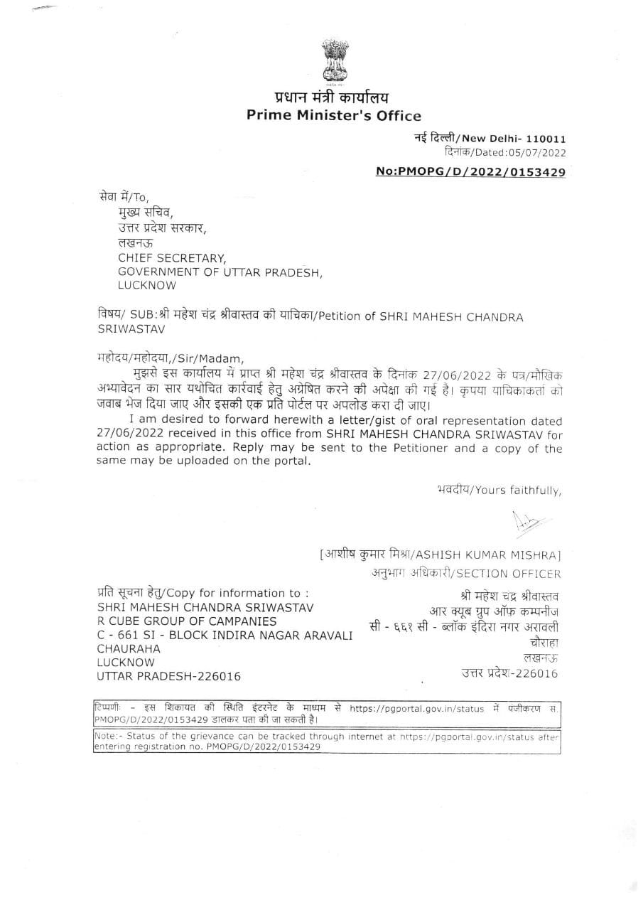 लखनऊ,(उत्तर प्रदेश)। उत्तर प्रदेश के चिकित्सा एवं स्वास्थ्य विभाग के अपर मुख्य सचिव अमित मोहन प्रसाद की शिकायत प्रधानमंत्री कार्यालय में की गई है। जिस पर पीएमओ ने मामले की जांच करने का आदेश मुख्य सचिव उत्तर प्रदेश को दिया है। शिकायतकर्ता महेश श्रीवास्तव ने आरोप लगाया है कि अपर मुख्य सचिव स्वास्थ्य ने विद्वेष की भावना से कई जिलों का भुगतान रोका हुआ है।शिकायतकर्ता ने जांच की मांग की थी। पीएमओ ने शिकायत का संज्ञान लेते हुए जांच करने का आदेश दिया है।
