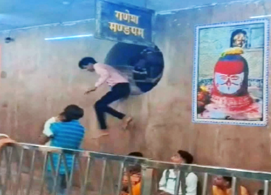 उज्जैन/मध्य प्रदेश। विश्व प्रसिद्ध बाबा महाकाल मंदिर में गणेश मंडपम के वेंटिलेशन से श्रद्धालुओं के कूदने का वीडियो सोशल मीडिया पर वायरल हुआ है। इसके बाद मंदिर समिति ने वेंटीलेशन पर स्टील के सरिया लगवा दिए हैं। इस घटना ने मंदिर की सुरक्षा व्यवस्था पर सवाल खड़े कर दिए हैं, जबकि मंदिर में प्राइवेट सुरक्षा गार्ड, मंदिर कर्मचारी और पुलिस तैनात रहते हैं और चप्पे-चप्पे पर कैमरे लगे हैं। इसके बावजूद श्रद्धालु शॉर्टकट रास्ते के लिए वेंटीलेशन से कूद रहे हैं।