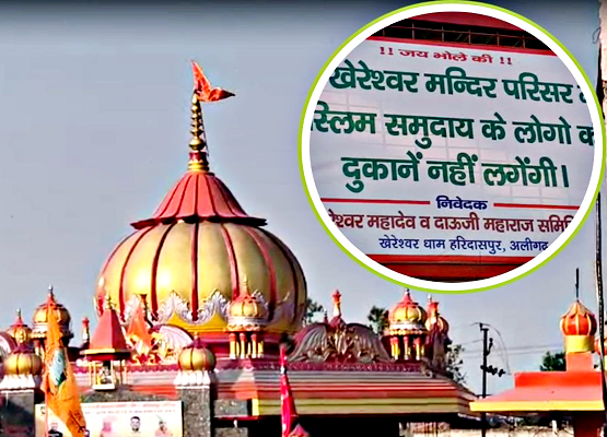 अलीगढ़/उत्तर प्रदेश। अलीगढ़ जिले में स्थित श्री खेरेश्वर महादेव और दाऊजी महाराज मंदिर परिसर में अब मुस्लिम समुदाय के लोग अपनी दुकान लगाकर समान नहीं बेचेंगे। मंदिर समिति परिषद द्वारा पूरे मंदिर परिसर में इसको लेकर पोस्टर लगाए गए हैं। पोस्टर में साफतौर पर लिखा गया है कि श्री खेरेश्वर मंदिर परिसर में मुस्लिम समुदाय के लोगों की दुकान नहीं लगेंगी। इसको लेकर मंदिर परिसर में हर जगह इन पोस्टरों को चस्पा किया गया है। कुछ दिन पहले मुस्लिम युवक द्वारा लेडीज अंडरगारमेंट्स बेचने के बाद विवाद मंदिर में विवाद उत्पन्न हुआ था।