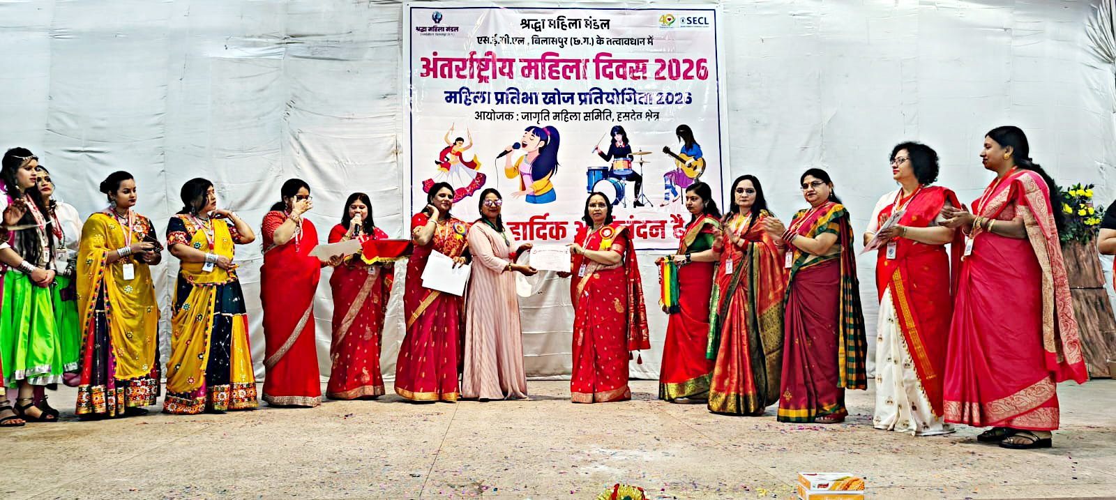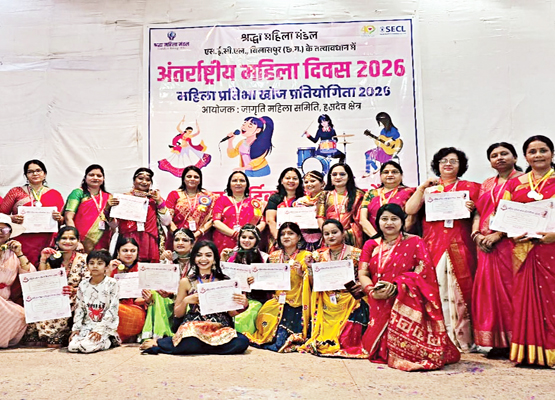 सुमिता शर्मा,अनूपपुर/मध्य प्रदेश। हसदेव क्षेत्र में जागृति महिला समिति द्वारा अंतर्राष्ट्रीय महिला दिवस के अवसर पर “प्रतिभा प्रदर्शन” कार्यक्रम का आयोजन कोयलांचल की महिलाओं के लिए किया गया। यह आयोजन श्रद्धा महिला मंडल की अध्यक्ष श्रीमती शशि दुहनएवं उपाध्यक्षगणों के मार्गदर्शन में जागृति महिला समिति की अध्यक्ष डॉ॰ सरोज बाला बिश्नोई के नेतृत्व में किया गया इस अवसर पर महिलाओं की प्रतिभा को प्रोत्साहित करने के लिए विभिन्न प्रकार की प्रतियोगिताएँ आयोजित की गईं, जिनमें प्रतिभागियों ने उत्साहपूर्वक भाग लेकर अपनी कला और प्रतिभा का प्रदर्शन किया। कार्यक्रम का शुभारंभ दे प्रज्वलन एवं गणेश वंदना से शुरू किया गया । विभिन्न आयोजित कार्यक्रम में एकल गायन प्रतियोगिता में प्रथम स्थान मोनी बरुआ, द्वितीय स्थान पुष्पा नेताम तथा तृतीय स्थान संगीता तिवारी ने प्राप्त किया। एकल नृत्य प्रतियोगिता में प्रथम स्थान चंदा नामदेव, द्वितीय स्थान डॉ. रेणुका तथा प्रगति गुप्ता को प्राप्त हुआ, जबकि खुशबू एवं संगीता तिवारी को सांत्वना पुरस्कार से सम्मानित किया गया।मंच संचालन प्रतियोगिता में प्रथम स्थान श्रीमती रंजना मिश्रा, द्वितीय स्थान तृप्ति पाण्डेय तृतीष स्थान माला तिवारी एवं सोनम थावड़े को प्राप्त हुआ, जबकि किरण मिश्रा एवं संगीता तिवारी को सांत्वना पुरस्कार प्रदान किया गया।
