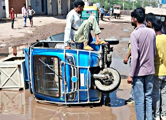 बाहरी दिल्ली। बाहरी दिल्ली में मुंडका अंडरपास के नजदीक सड़क पर गड्ढे हादसों का कारण बन रहा है। फ्रेंड्स इन्क्लेव चौक पर सवारी लेकर जा रहा रिक्शा अचानक से पलट गया। हादसे में सवारियों को मामूली चोटें आई।